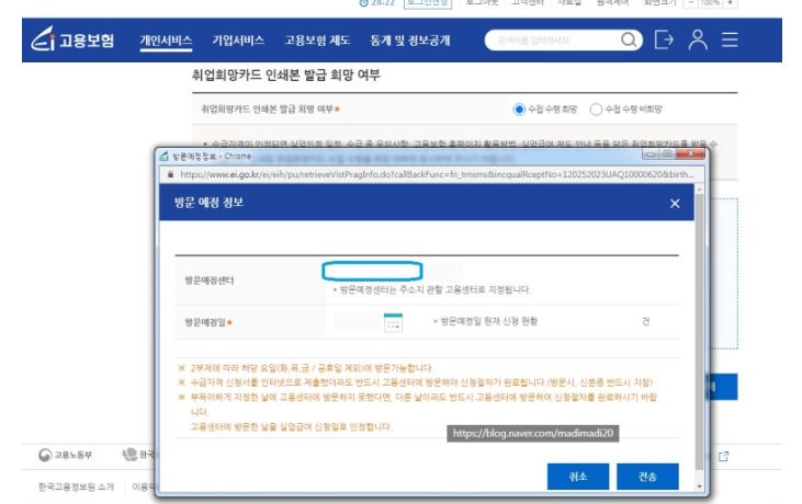 신청서를 모두 작성한 후 제출을 누르면 방문예정센터가 자동으로 나옵니다. 2부제 운영을 하는 고용센터도 있다고 하니 방문가능 요일을 전화로 알아보시기 바랍니다. 이제 방문예정일을 신청하고 전송을 누르면 모든 신청서 작성이 완료됩니다.