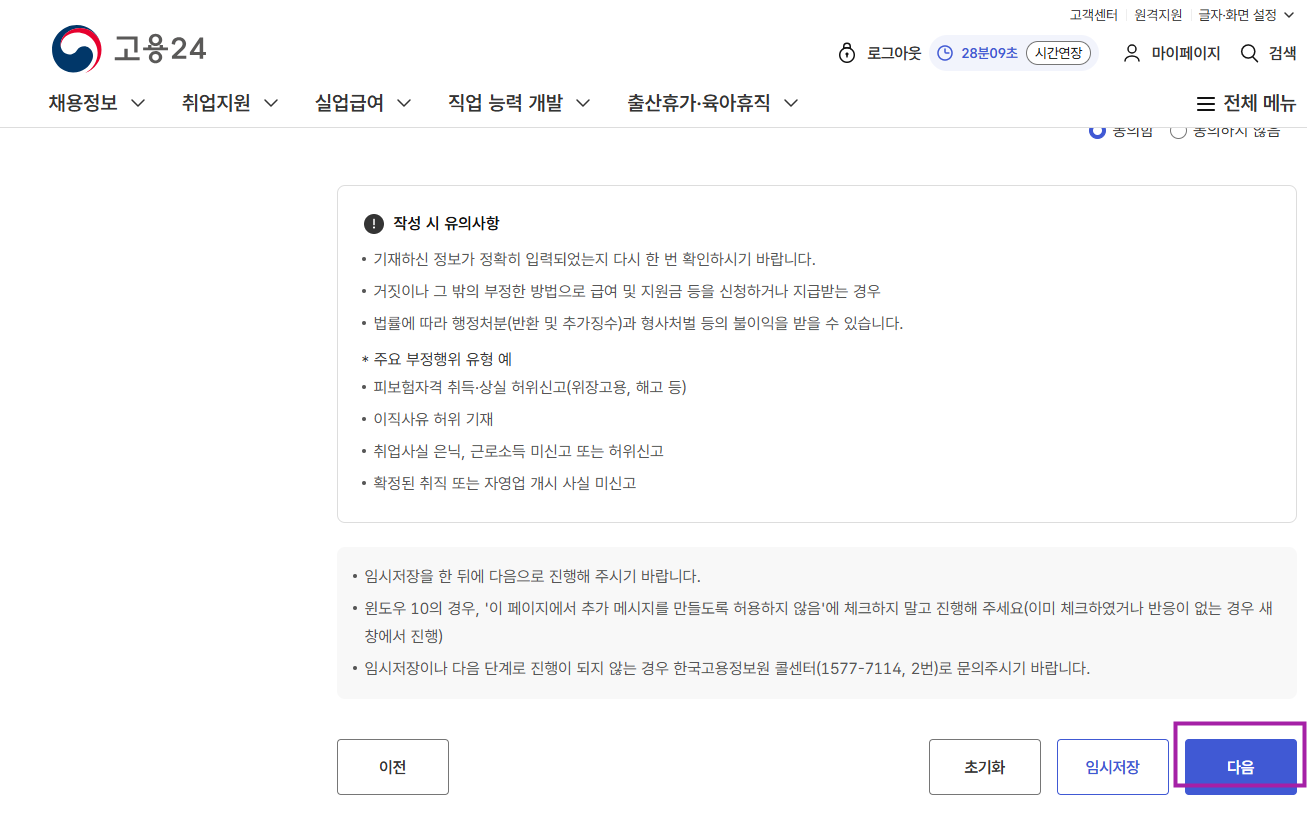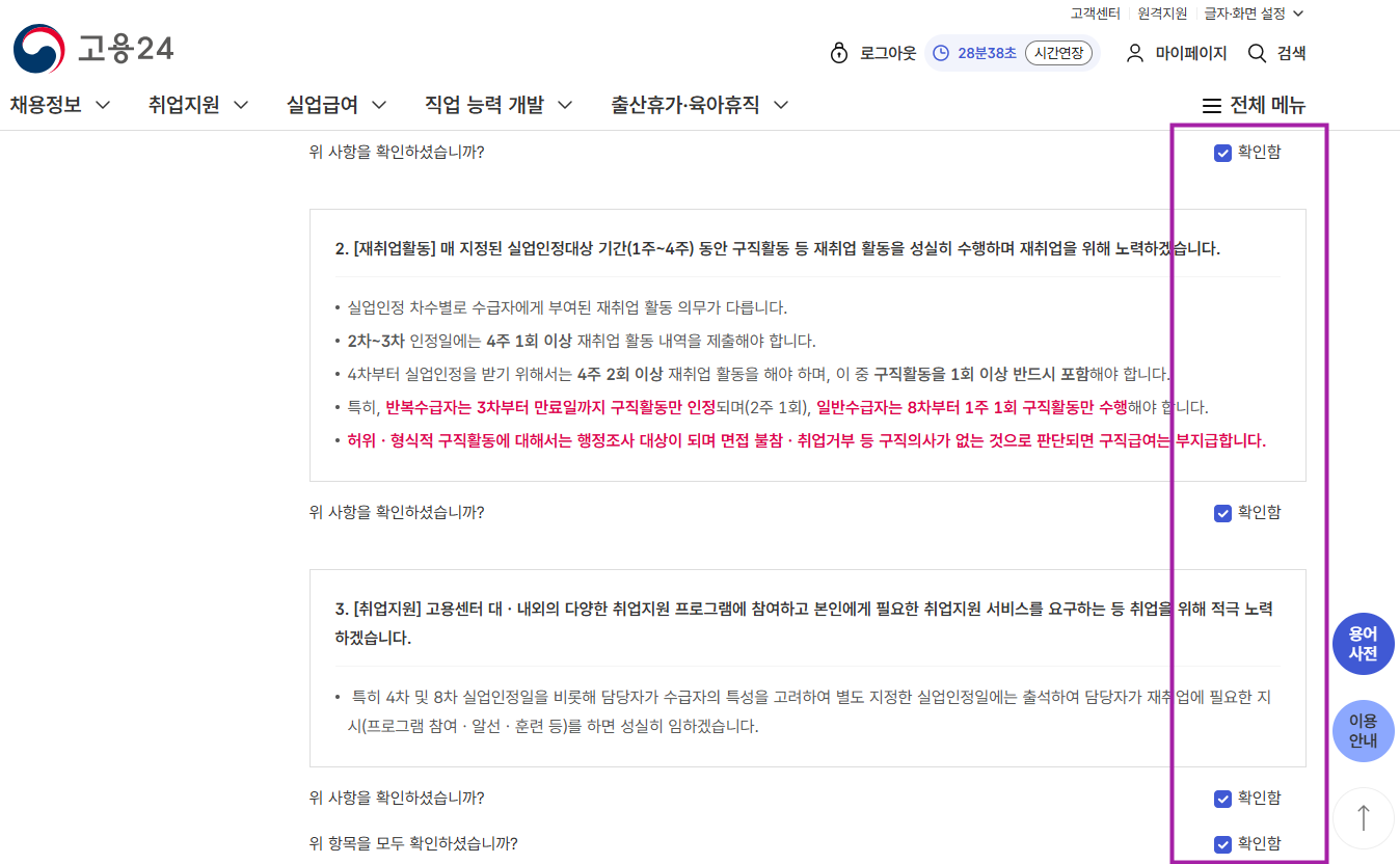 ▶ 재취업을 위한 약속 옆에 확인함을 위의 사진처럼 체크합니다. → 확인함 X 4번