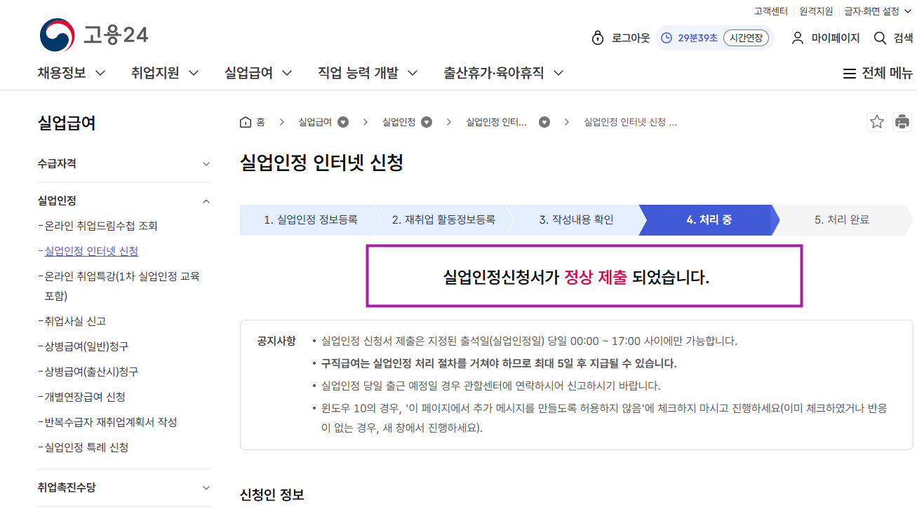 ▶ 지금까지 잘 따라하셨다면 이렇게 [실업인정신청서가 정상 제출 되었습니다.]라는 문구를 볼 겁니다.