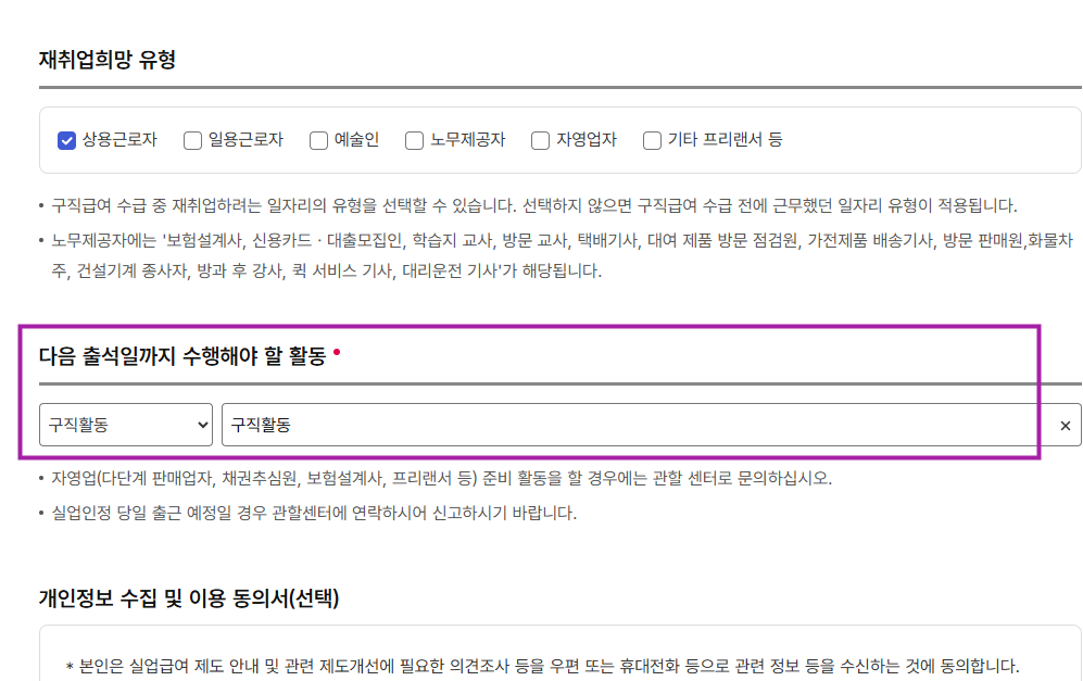 ▶ 네모칸 안에 ∨ 버튼 눌러서 위의 화면처럼 둘 다 구직활동으로 체크하세요.