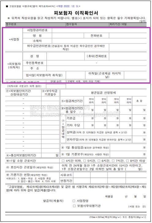 처음 듣게 되는 용어에 당황할 수 있어요. 여기서 이직확인서란 직장에서 퇴사한 사실을 확인하기 위한 문서로 이직사유, 이직일, 평균임금, 피보험단위기간 등을 작성하도록 되어 있습니다.