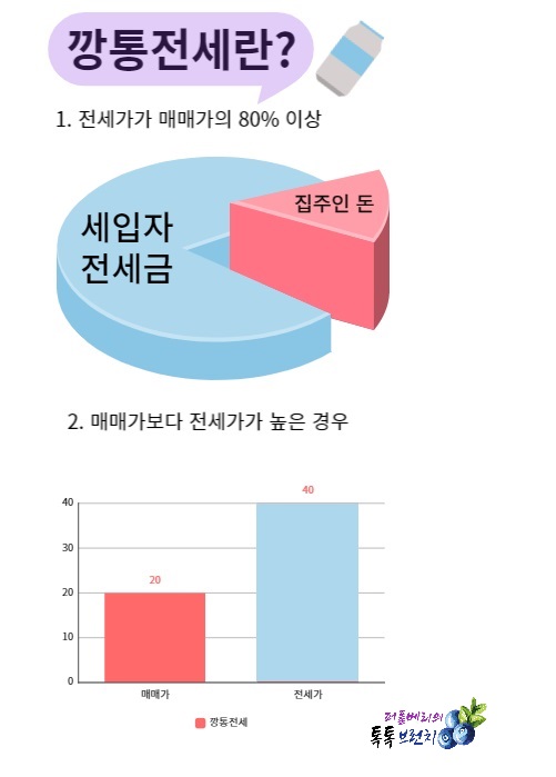.즉 '깡통전세'란 전세가격이 집 매매가격의 80% 이상이 되거나 매매가격보다 높은 경우를 말합니다. 경기가 좋아서 집값이 치솟을 때야 어찌어찌 넘어간다고 하지만 요즘처럼 집값이 떨어지는 때에는 세입자가 전세보증금을 돌려받을 수 있다는 보장이 없어집니다. 물론 집주인이 돈이 많다면야 어떻게든 돈을 융통해서 세입자에게 보증금을 돌려주겠지요. 하지만 갭투자를 통해 시세차익을 보고 집을 구매했던 집주인이나 경제사정이 안좋아진 경우는 전세 보증금을 받기 힘들어 질 수 있습니다.