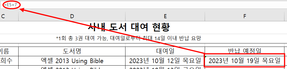 - 즉 겉으로 보기에 반납 예정일에 적힌 날짜도 다를게 없어보이지만 사실 이것은 대여일 + 7일이라는 수식이 입력되어 계산된 상태임