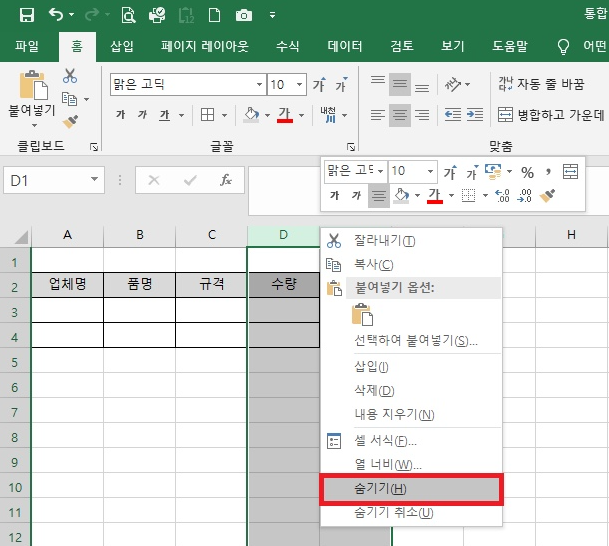 - 연속적으로 붙어있는 행이나 열을 숨기고 싶을 때 : 숨기고 싶은 곳을 드래그해서 클릭 → 마우스 우클릭 → 숨기기