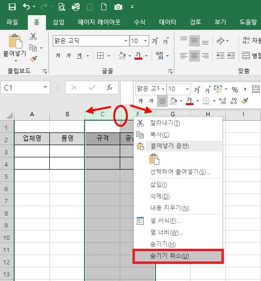 - 숨기기 취소하는 방법 : 숨기기가 되어 있는 행 또는 열의 양쪽을 선택 → 마우스 우클릭 → 숨기기 취소