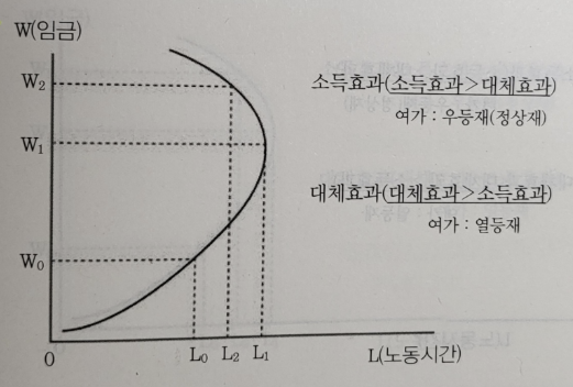- 대체효과 : 임금이 상승하면 여가는 감소하고 노동공급은 증가한다